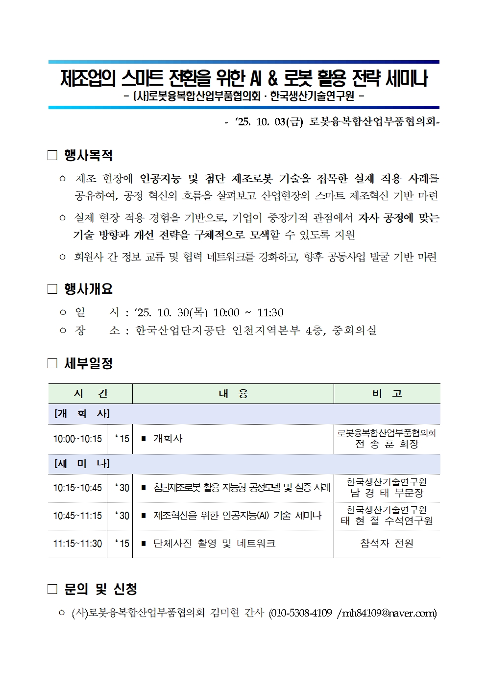 제조업의 스마트 전환을 위한 AI & 로봇 활용 전략 세미나를 아래와같이 안내드립니다.