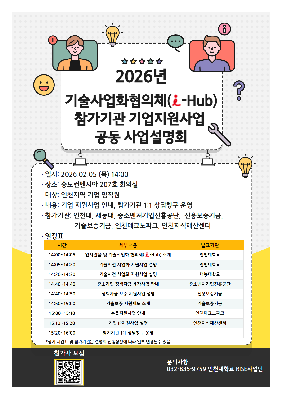 - 참가기관: 인천대, 재능대, 중소기업벤처기업진흥공단, 신용보증기금, 기술보증기금, 인천테크노파크, 인천지식재산센터
