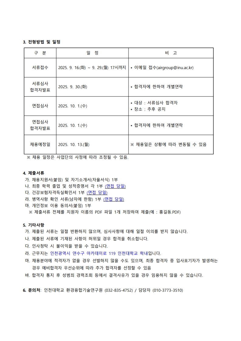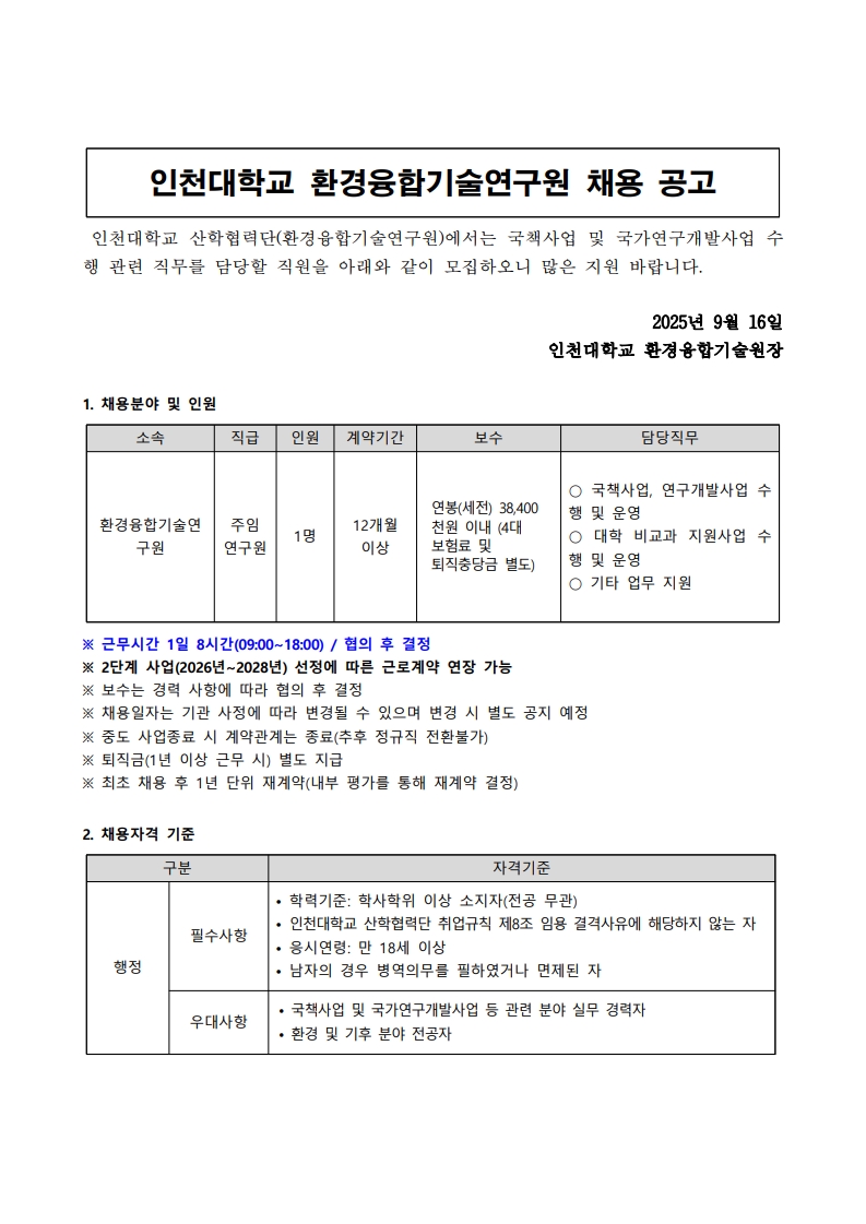 인천대학교 환경융합기술연구원 연구원 채용 공고(~09.29.(월) 17:00까지)