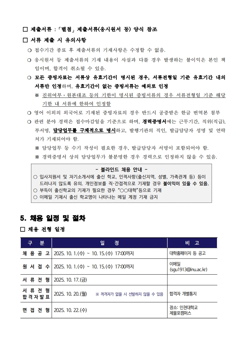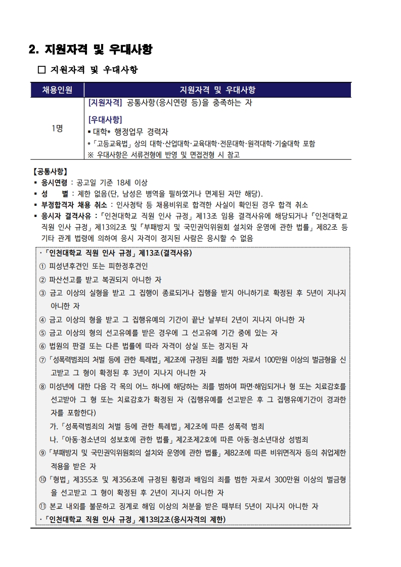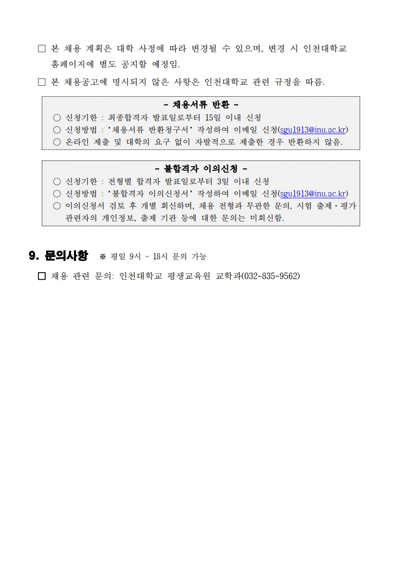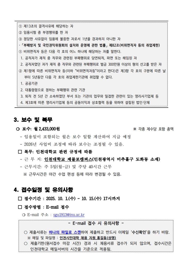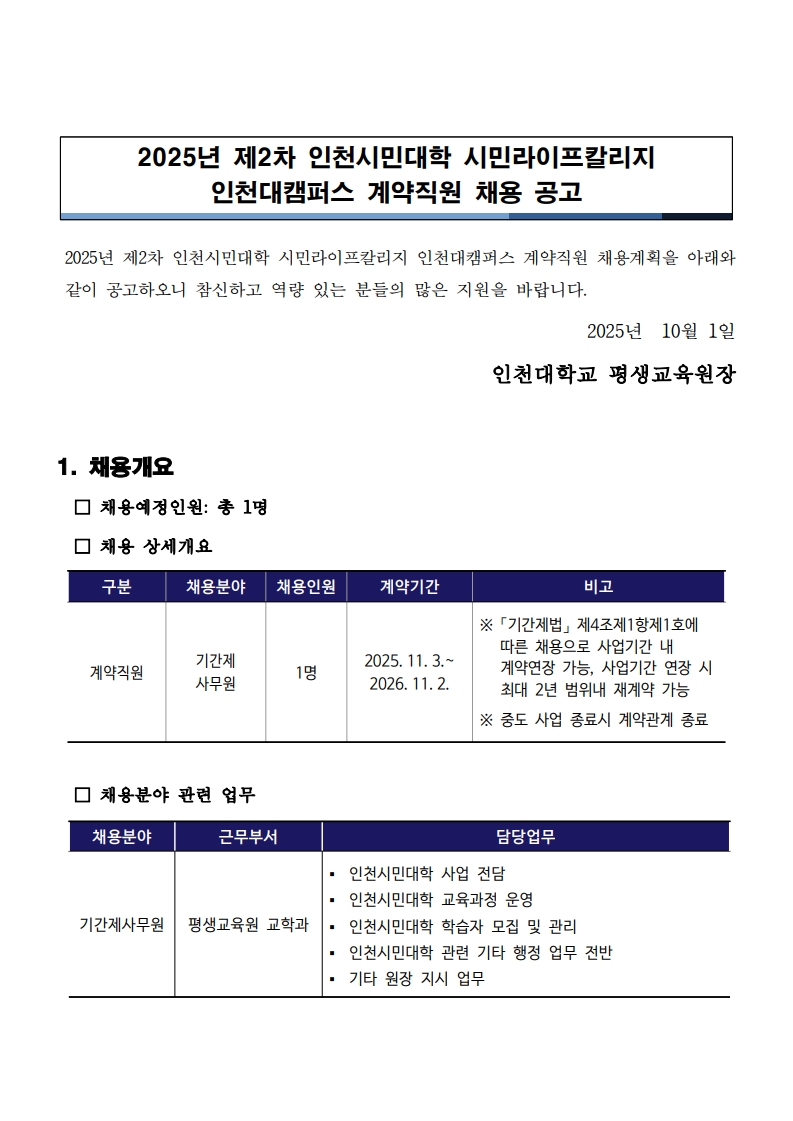 2025년 제2차 인천시민대학 시민라이프칼리지 인천대캠퍼스 계약직원 채용 공고(~10.15.(수) 17시까지)