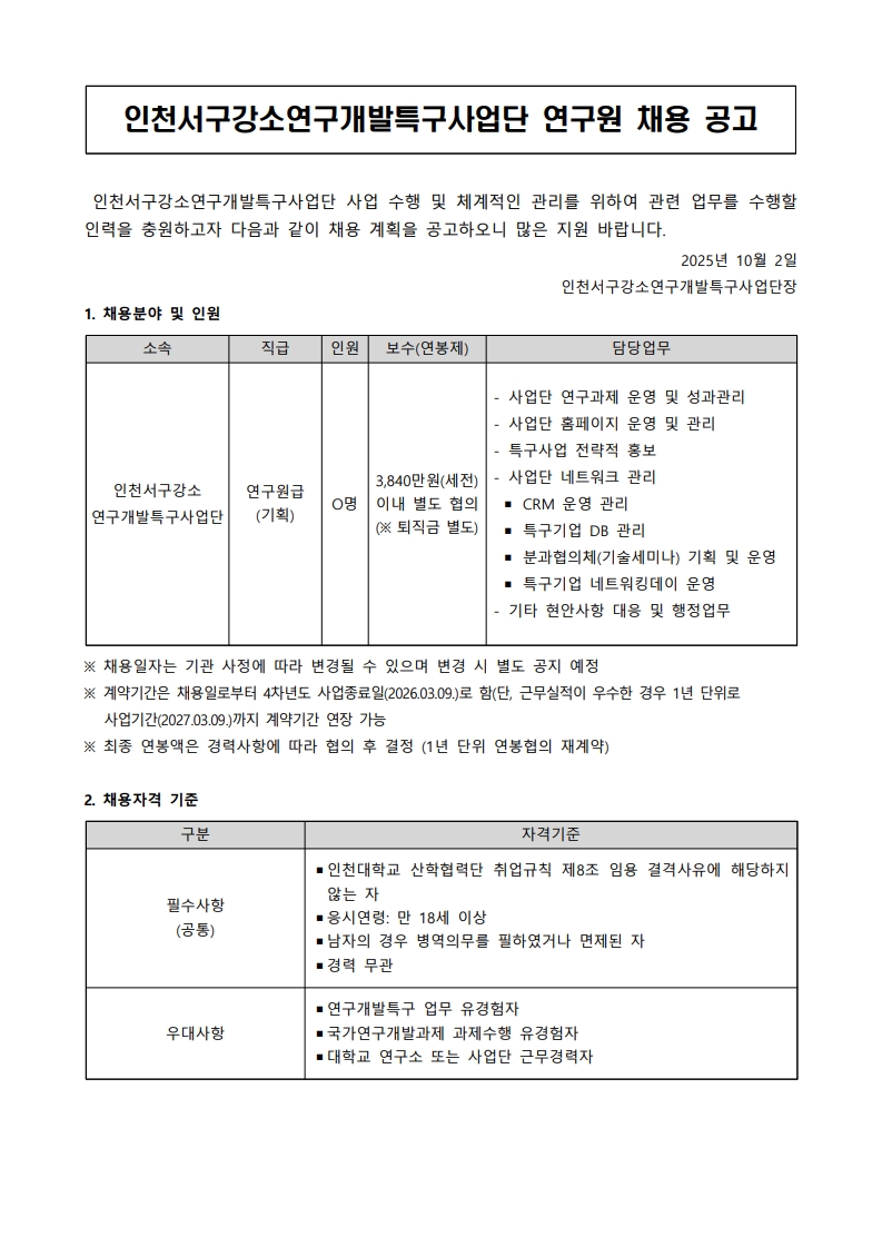 2025년 인천서구강소연구개발특구사업단 연구원 채용 공고(~10.16.(목) 17:00까지)