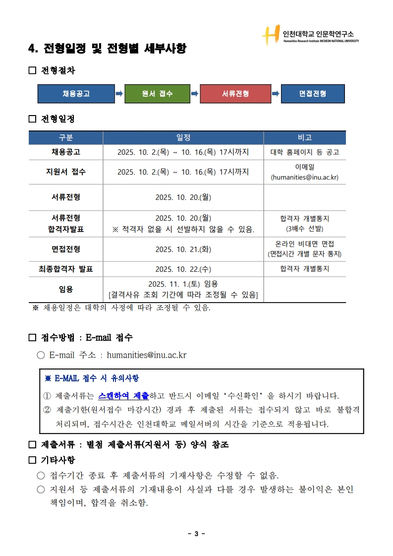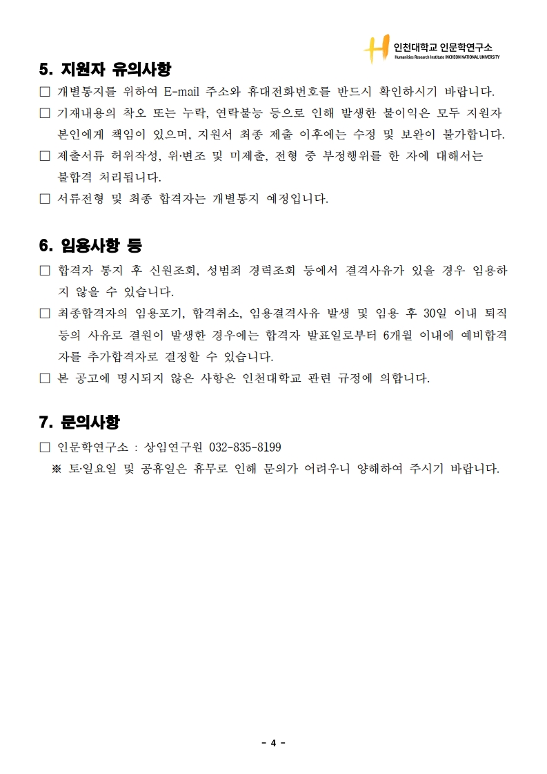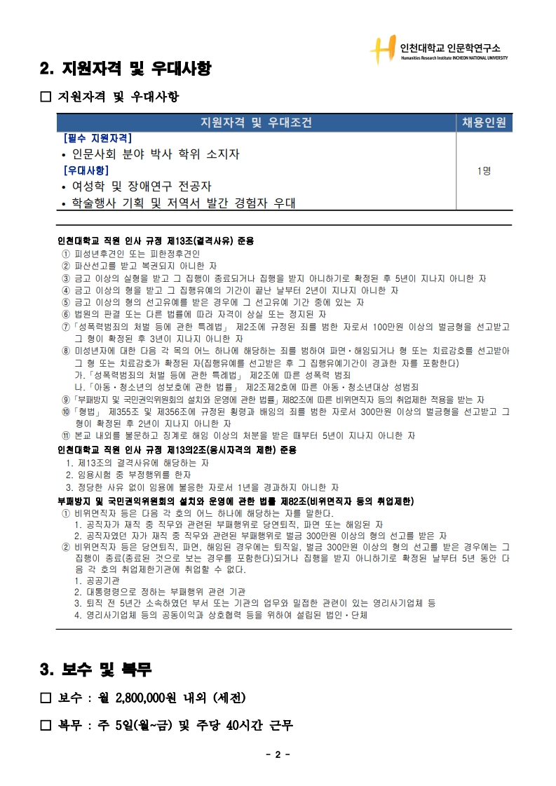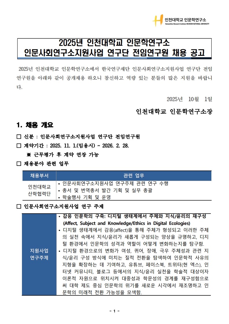 2025년 인천대학교 인문학연구소 인문사회연구소지원사업 행정직원 채용 공고(~10.24.(금) 15:00까지)
