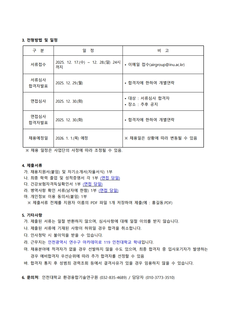 인천대학교 환경융합기술연구원 연구원 채용 공고(~12.28.(일) 24:00까지)