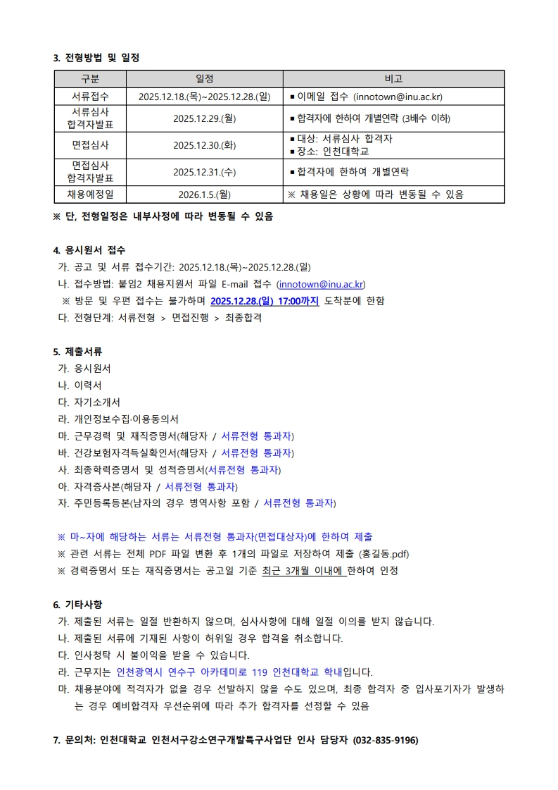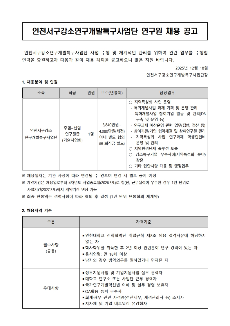 2025년 인천서구강소연구개발특구사업단 연구원 채용 공고(~12.28.(일) 17:00까지)