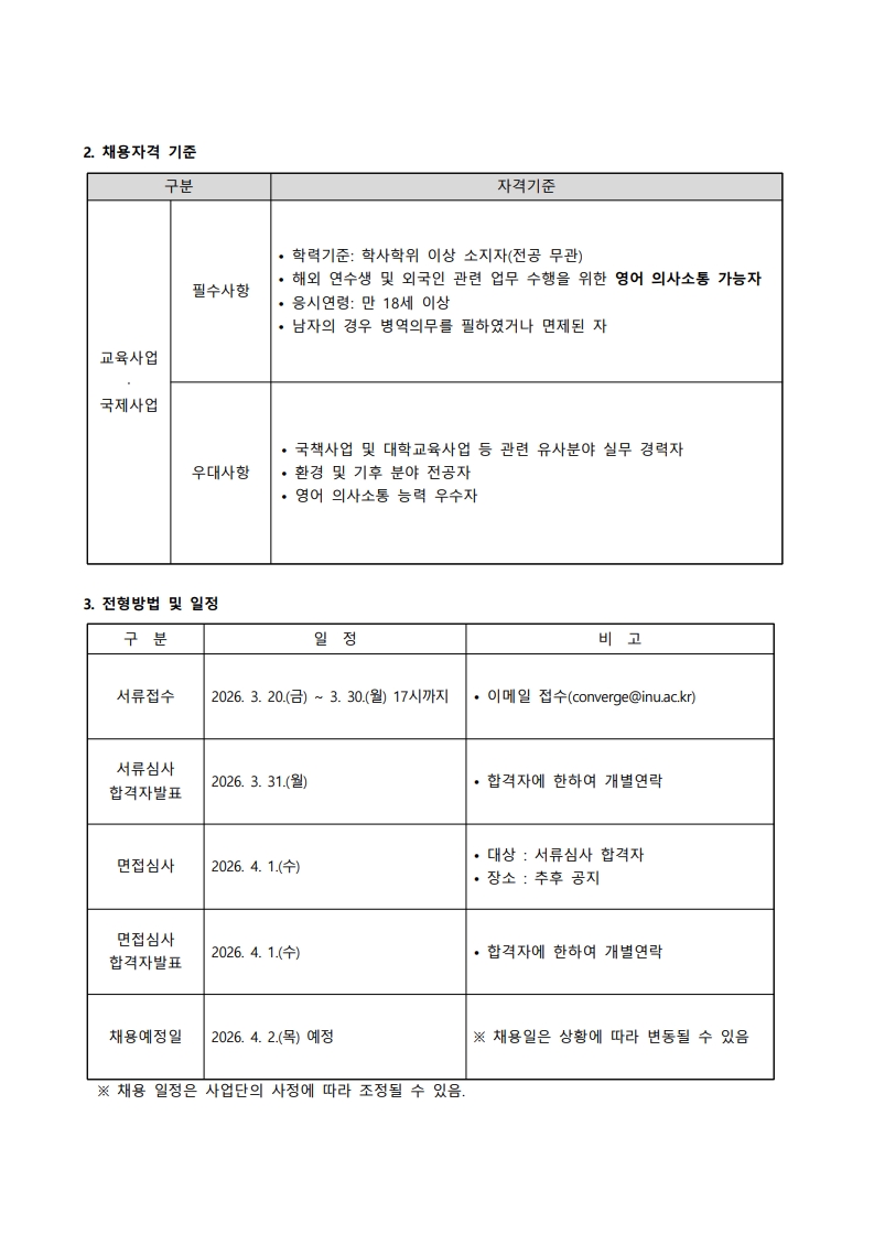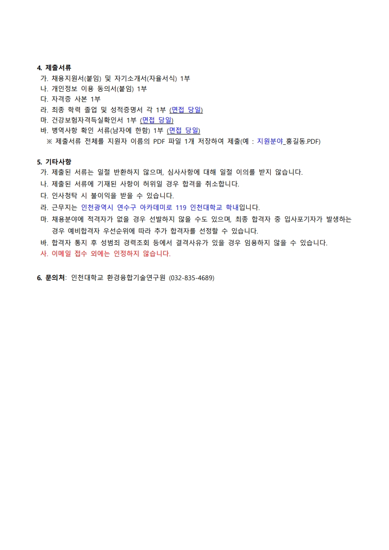 인천대학교 환경융합기술연구원 연구원 채용 공고(~03.18.(수) 17:00까지)