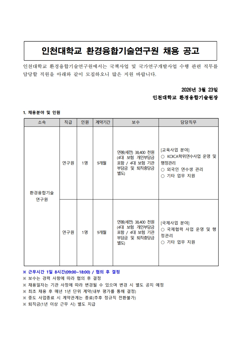 인천대학교 환경융합기술연구원 연구원 채용 공고(~3.30.(월) 17:00까지)