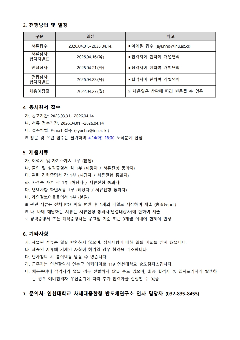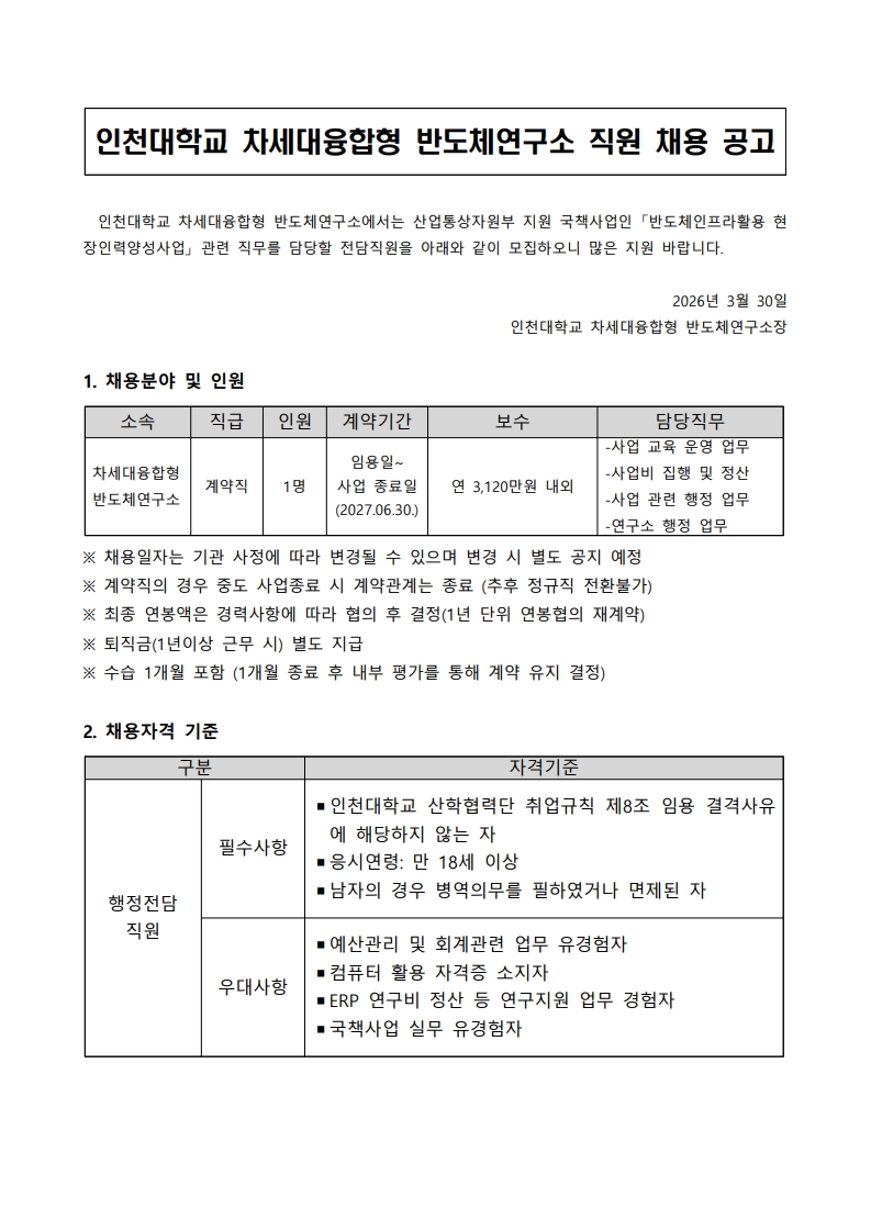 인천대학교 차세대융합형 반도체연구소 연구원 채용(~4.14.(화) 16:00까지)
